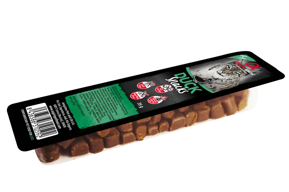 Przysmaki kostka Alpha Spirit to aż 85% świeżego mięsa i ryb. Zawierają tylko naturalne składniki, dostarczane przez lokalnych dostawców. Przygotowywane są w niskiej temperaturze, dzięki czemu zachowują właściwości odżywcze.Kostki pakowane są na tackach po 35g. Jest to gwarancja świeżości oraz wygody podawania smakołyku.