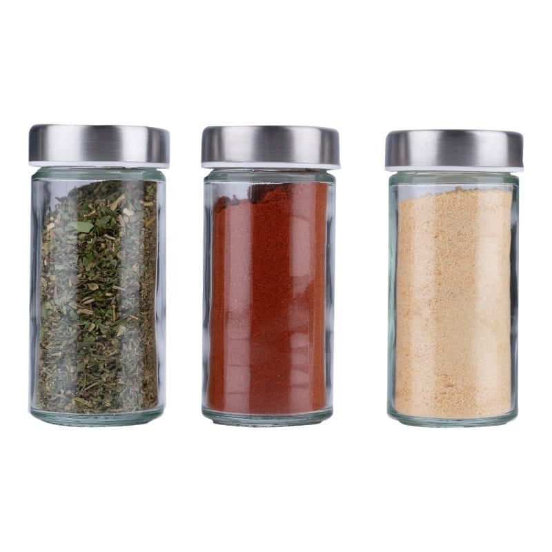 - 12 szklanych słoiczków z pokrywkami sitkowymi: hartowane szkło z zakrętkami z tworzywa, przezroczyste dla łatwej identyfikacji przypraw i precyzyjnego dozowania.