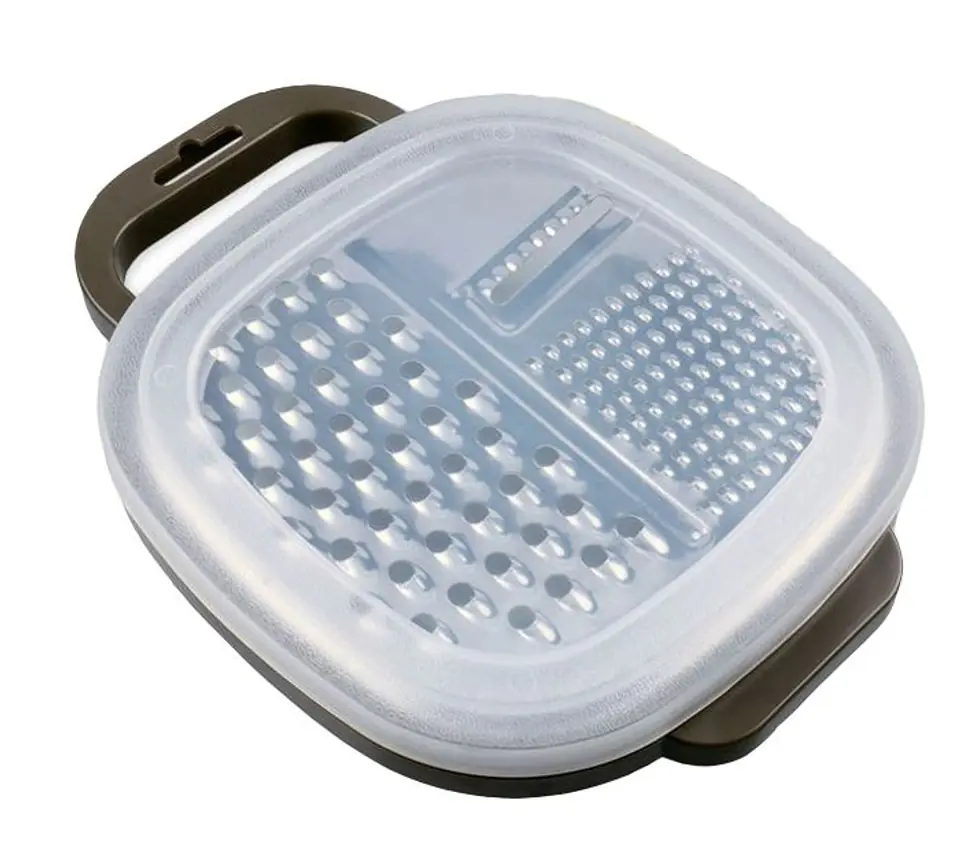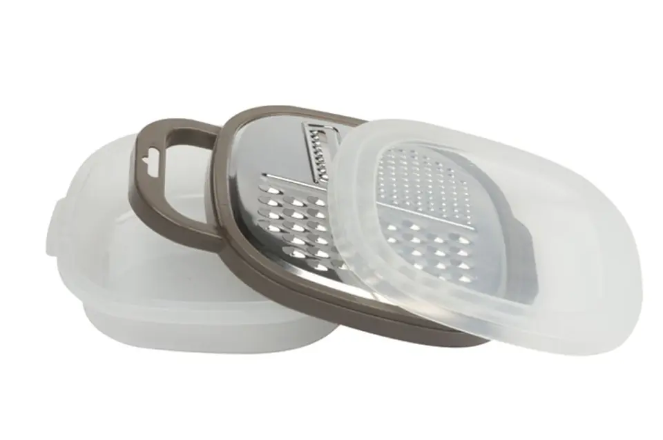 Uniwersalna tarka z trzema rodzajami noży i tacką na odpady w kolorze szarym. Dodatkowa pokrywa chroni tarkę podczas przechowywania. Waga: 0,4 kg.