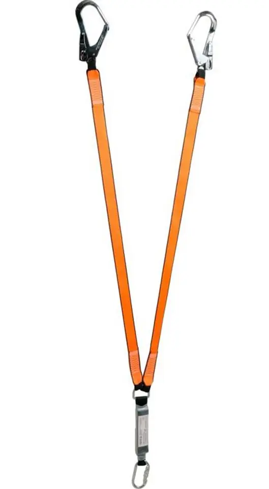 Amortyzator bezpieczeństwa YT-74225 z dwiema taśmami oraz z kompletem karabińczyków to element systemu powstrzymywania upadku łączącego szelki bezpieczeństwa z punktem kotwiczącym. Amortyzator z podwójną taśmą dedykowany jest do prac w miejscach z wąskim polem manewru oraz z potrzebą częstej zmiany punktu kotwiczenia np. podczas prac na rusztowaniach, kratownicach czy zwyżkach. Zastosowanie zatrzaśników hakowych o dużym prześwicie umożliwia szybkie przepinanie się na zmianę w trakcie przemieszczania się, tym samych zachowując ciągłość asekuracji. Amortyzator bezpieczeństwa został wykonany z odpowiednio pozszywanej taśmy poliestrowej. Podczas powstrzymywania upadku specjalnie zaprojektowane szwy ulegają stopniowemu rozpruciu spowalniając prędkość upadku