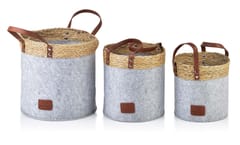 Komplet 3 koszy z serii AMPARO marki MONDEX. Wykonany z filcu, trawy morskiej i sztucznej skóry. Jasny szary filc w połączeniu z brązem prezentuje się niezwykle elegancko. Posiada emblemat z wytłoczonym logo marki.AMPARO Komplet KOSZY WYMIARY:KOSZ L DŁUGOŚĆ 28CM SZEROKOŚĆ 28CM WYSOKOŚĆ 28CMKOSZ M DŁUGOŚĆ 24CM SZEROKOŚĆ 24CM WYSOKOŚĆ 24CMKOSZ S DŁUGOŚĆ 20CM SZERKOŚĆ 20CM WYSOKOŚĆ 20CM