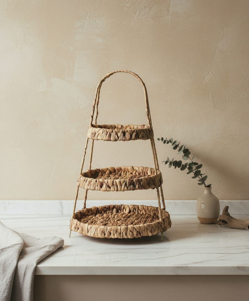 Patera trzypoziomowa AMPARO to wyjątkowy element dekoracyjny i użytkowy, który łączy naturalny urok z funkcjonalnością. Wykonana z hiacyntu wodnego, zachwyca plecioną strukturą i ciepłym, organicznym wyglądem, doskonale komponującym się z wnętrzami w stylu boho, skandynawskim, eko czy rustykalnym.Posiada trzy poziomy o średnicach 29 cm, 24 cm i 19 cm, a jej wysokość wynosi 50 cm, co zapewnia wygodne i efektowne eksponowanie owoców, wypieków, przekąsek czy innych dekoracji stołowych. Dzięki stabilnej konstrukcji i starannemu wykonaniu, patera jest praktyczna i estetyczna, stanowiąc doskonałe uzupełnienie zarówno codziennego nakrycia stołu, jak i eleganckich przyjęć.Jej lekka, ale solidna konstrukcja sprawia, że łatwo można ją przenosić i ustawiać w różnych miejscach, dodając przestrzeni naturalnego wdzięku i harmonii. AMPARO to nie tylko funkcjonalny stojak, ale również stylowy element dekoracyjny, który podkreśli piękno każdej aranżacji stołu.średnica każdego poziomu: 29cm + 24cm + 19cmwysokość całości: 50cm