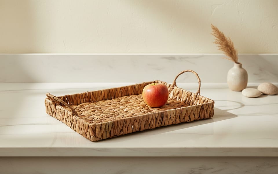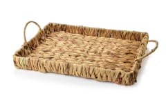 Taca AMPARO to elegancki i funkcjonalny dodatek do każdego wnętrza. Wykonana z hiacyntu wodnego, zachwyca naturalnym wyglądem i wyjątkową strukturą, która nadaje jej rustykalny, a zarazem stylowy charakter.Dzięki wymiarom 42x30x4,5 cm jest praktyczna i wystarczająco przestronna, aby pomieścić filiżanki, talerze czy dekoracyjne akcesoria. Dwa wygodne uchwyty ułatwiają przenoszenie, co czyni ją idealnym rozwiązaniem zarówno do serwowania, jak i do wykorzystania jako element dekoracyjny w salonie, kuchni czy na tarasie.Naturalny materiał sprawia, że każda taca jest unikatowa, a jej pleciona faktura dodaje ciepła i przytulności wnętrzu. Doskonale komponuje się z aranżacjami w stylu boho, skandynawskim, eko oraz rustykalnym. To praktyczny i estetyczny dodatek, który wnosi do domu odrobinę natury i elegancji.wymiar: 42x30x4,5cm