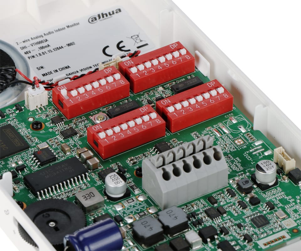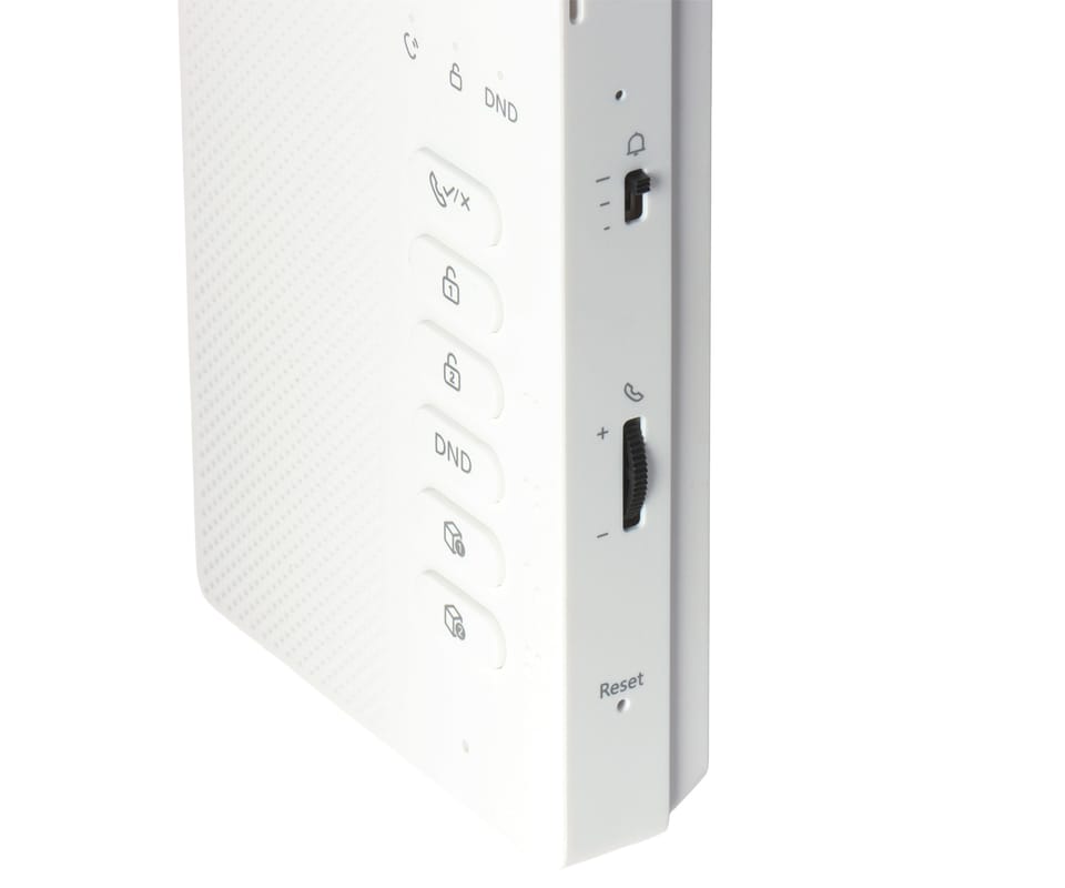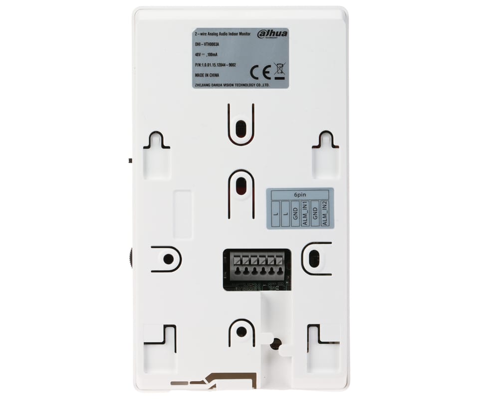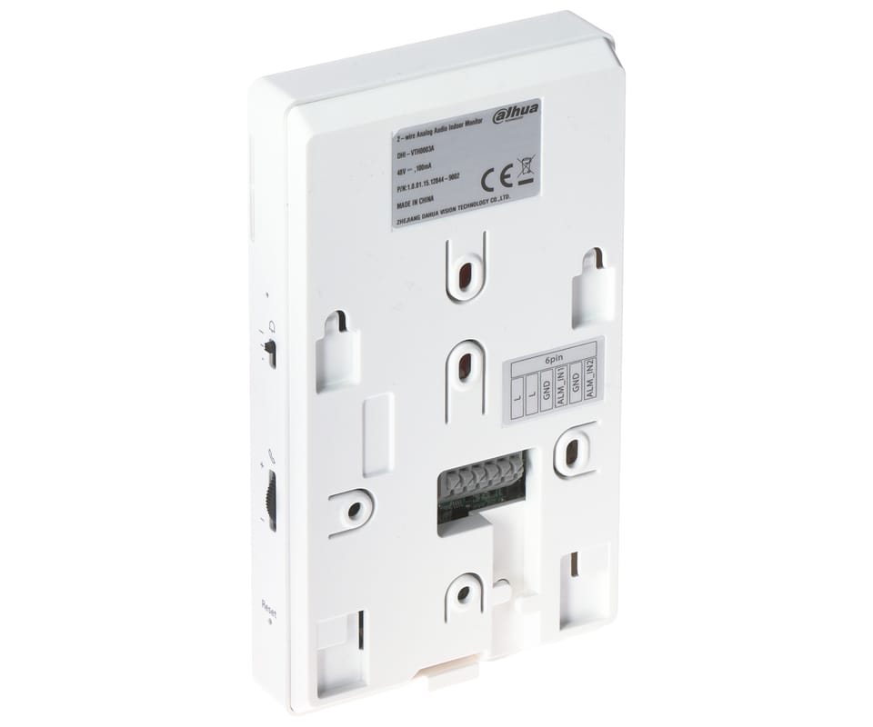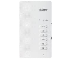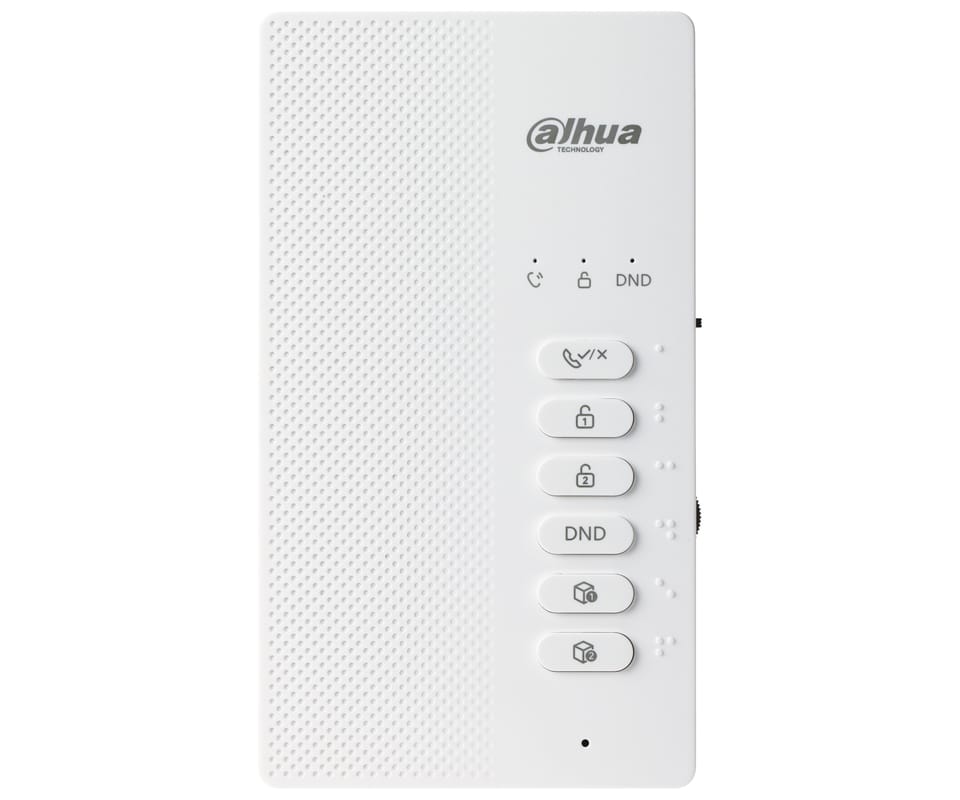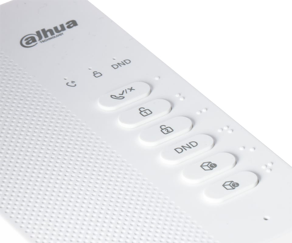 DHI-VTH0003A to 2-żyłowy, analogowy unifon głośnomówiący do systemów wideodomofonowych, obsługujący rozmowę dwukierunkową (half-duplex) z panelem bramowym. Zastosowano przyciski mechaniczne z funkcjami jednoprzyciskowymi (odbiór, otwarcie, DND, wyciszenie), regulację głośności i własne dzwonki, a także 2 wejścia alarmowe do podłączenia przycisków dzwonka. Przewidziano również konfigurację monitora głównego i podrzędnych oraz odbiór połączeń grupowych. Zasilanie jest dostarczane przez dystrybutor (zasilacz dostępny osobno).