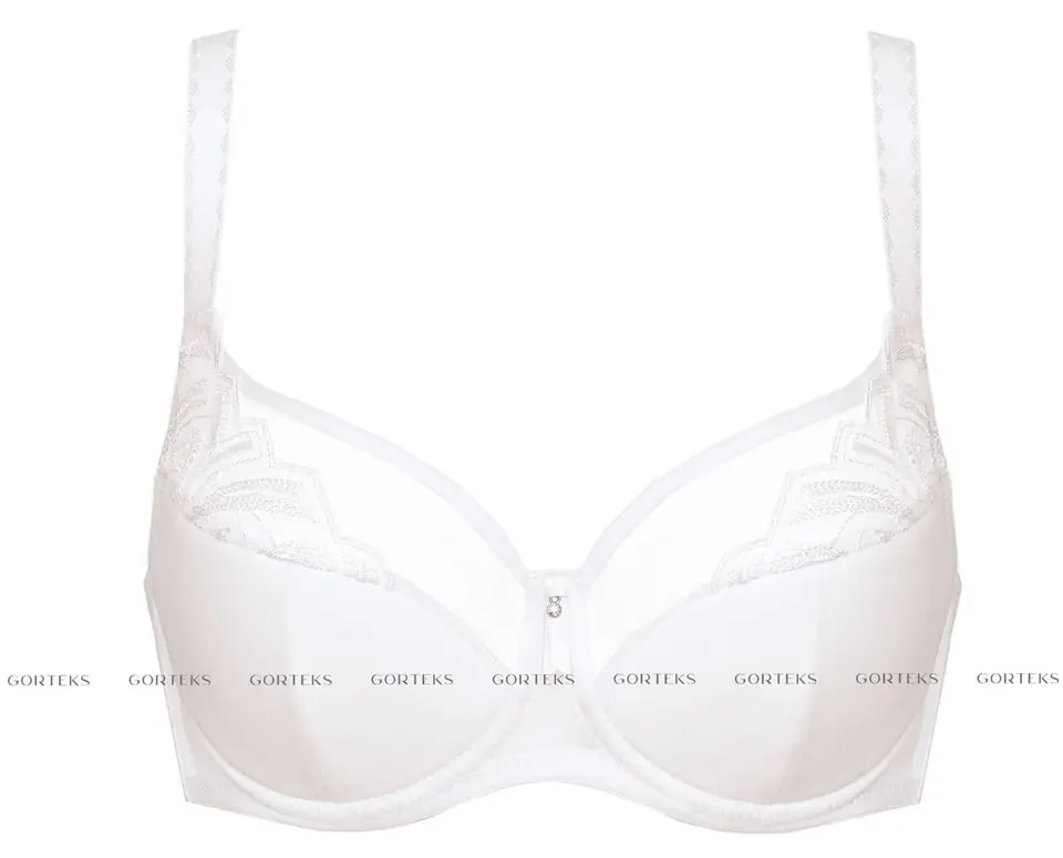 - Dolna część misek wykonana z cienkiej pianki gorseciarskiej, a górna z połyskującego haftu, dzięki czemu biustonosz doskonale dopasowuje się do kształtu piersi. Świetnie sprawdzi się przy asymetrii.