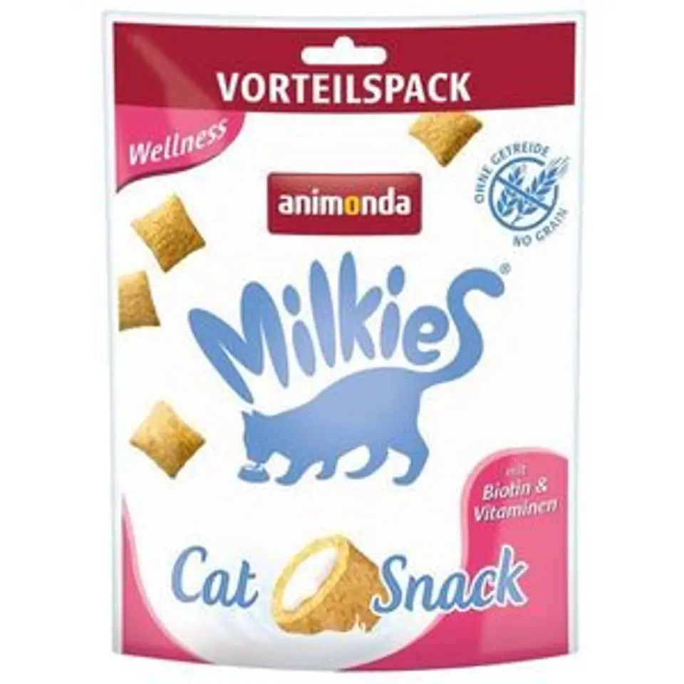 Animonda Milkies Wellness 120 g w skrócie: Pokarm uzupełniający dla dorosłych kotów Bezzbożowy: nadający się w dodatku dla zwierząt z nadwrażliwością i alergiami pokarmowymi Z biotyną i witaminami: poprawiającymi zdrowie skóry i kondycję sierści Chrupiące i pyszne: pyszne poduszeczki, które koty uwielbiają Wartościowe składniki: z drobiem, warzywami i minerałami Mniej niż 1,5 kcal w jednej poduszeczce Wypordukowane w Austrii