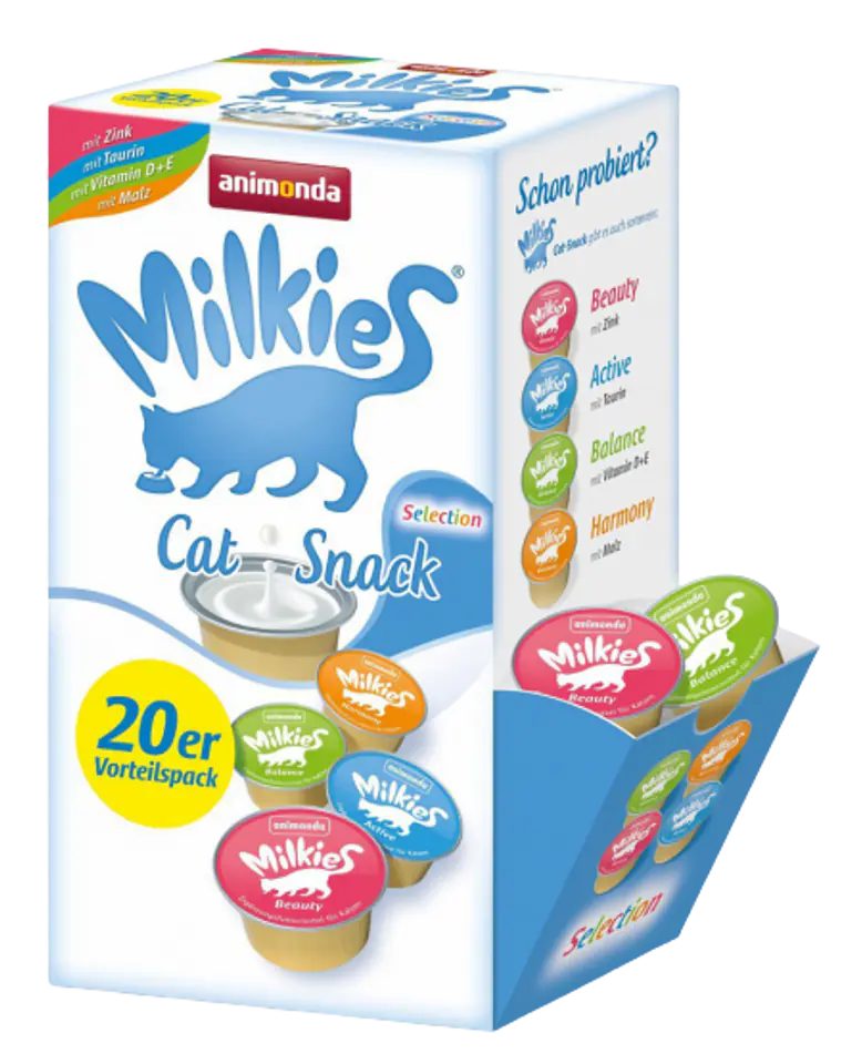 Lekkostrawny przysmak bez cukru, soi, konserwantów i barwników w małych kubeczkach, dzięki którym produkt zachowuje świeżość i jest łatwy do podania. Animonda Milkies Cat Snack Selection to zestaw 4 rodzajów mlecznych przysmaków dla kotów - Balance z witaminą D+E, Active z tauryną, Beauty z cynkiem i Harmony ze słodem.