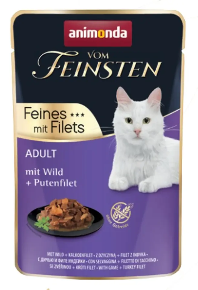 Animonda vom Feinsten Adult z kawałkami filetów to wysokiej jakości karma dla dorosłych kotów.Jakość mięsnych, surowych składników w delikatnych kawałkach w połączeniu z pysznym sosem i najlepszymi kawałkami filetów gwarantuje wyjątkową rozkosz.Wyśmienity posiłek dostarcza wszystkich niezbędnych składników odżywczych, których potrzebuje dorosły kot.Skład:52% mięso i produkty pochodzenia zwierzęcego (drób, wieprzowina, 8% filet z indyka, 4% dziczyzna), produkty pochodzenia roślinnego, minerałyAnaliza: