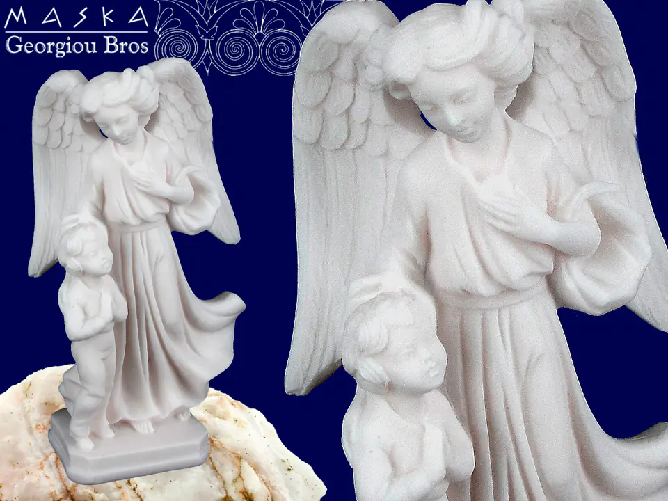 Alabastrowa figurka przedstawiająca Anioła Stróża z dzieckiem. Już od czasów starożytnych alabaster był wysoko cenionym kamieniem ozdobnym i dekoracyjnym. Niezliczona ilość wzorów stanowi inspirację do tworzenia własnych niepowtarzalnych zbiorów anio