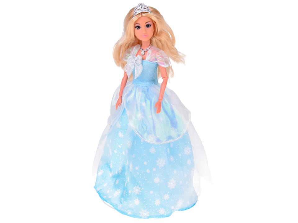 Ubrana w błękitną suknię, która mieni się jak lodowe kryształki w promieniach słońca, księżniczka wygląda jak bohaterka zimowej bajki. Materiał pod spodem ma narysowane płatki śniegu, wirujące na wietrze. Na jej głowie lśni srebrna tiara - symbol królewskiej mocy, dzięki której może zmieniać najzwyklejszy dzień w śnieżne marzenie. Dopełnieniem całej stylizacji oraz kompletem z tiarą jest jej srebrny naszyjnik.