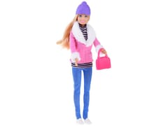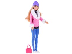 Elegancka lalka z długimi blond włosami ubrana w zimową stylizację, przypadnie do gustu każdej dziewczynce. Lalka posiada piękne długie włosy, z których można czesać modne fryzury, na głowie ma fioletową, zimową czapkę. Ubrana jest w stylową różową kurteczkę obszytą białym futerkiem, pod kurteczką lalka ubrana jest w golfik w paski. Na długich nogach założone ma niebieskie leginsy a na stopach białe markowe sneakersy. Całość uzupełnia różowa torebka. Kończyny lalki są ruchome, buzia z uśmiechniętą miną i niebieskimi oczami. Wzrost lalki to ok 30 cm.