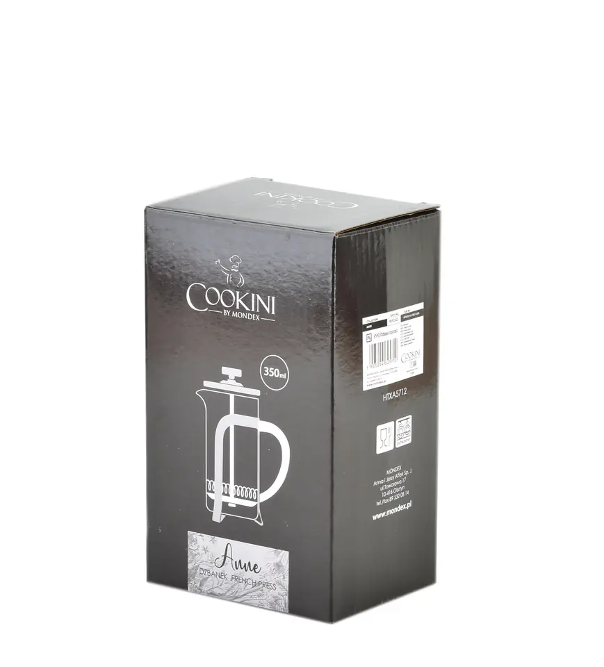 Dzbanek ANNE zwany french press to wyjątkowo prosty w obsłudze zaparzacz do kawy, iherbaty oraz ziół. To praktyczne urządzenie zostało wykonane ze stali nierdzewnej 18/8 oraz szkła borokrzemowego najwyższej jakości. Szklana rączka oraz odpowiednio wyprofilowana wylewka sprawiają, że french press jest komfortowy w użytkowaniu. Sitko skutecznie zapobiega przedostawaniu się fusów do gotowego naparu. producent: COOKINI model: ANNE zastosowanie: kawa, zioła, herbata materiał:stal nierdzewna 18/8 oraz szkło borokrzemowe DŁUGOŚĆ 7,50 cm SZEROKOŚĆ 12,00 cm WYSOKOŚĆ 17,00 cm French Press, 350ml waga: 266g / 328g z opakowaniem zapakowane jednostkowo w color box: 11x8,5xh18cm