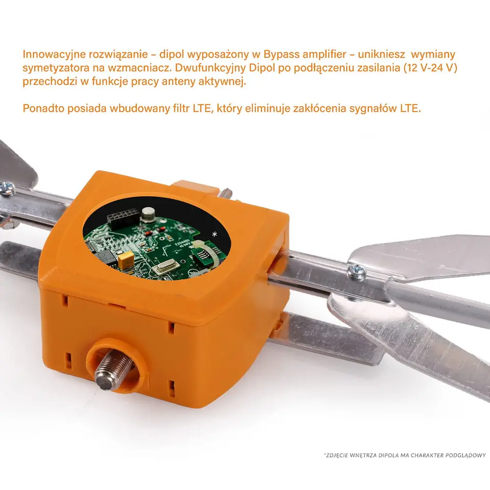 Umożliwia odbiór programów z nowego MUX-a w paśmie VHF. Przekładany dipol umożliwia odbiór programów VHF w polaryzacji poziomej lub pionowej.