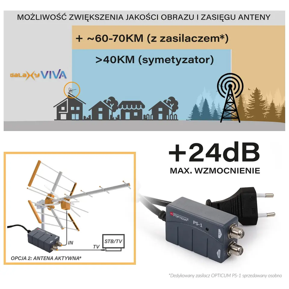 - Zysk energetyczny: VHF: 6-8dB, UHF: 10-14dB.