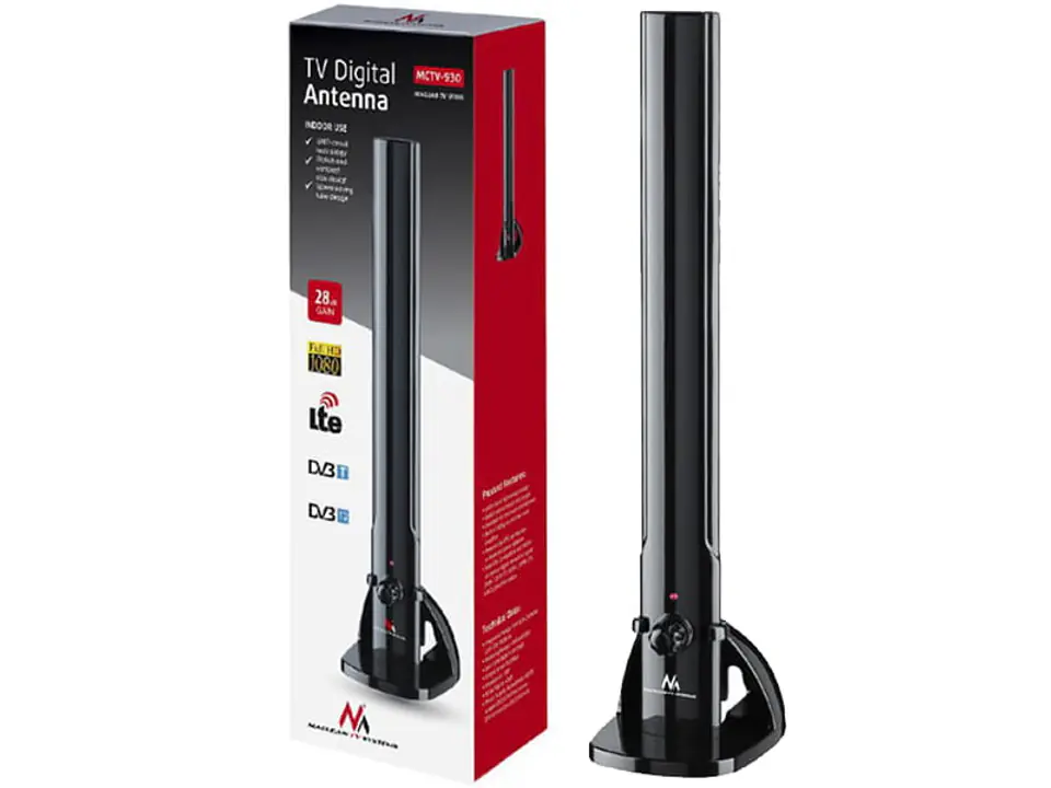W celu uzyskania najlepszych efektów odbioru zalecamy umieścić antenę najbliżej okna jak to możliwe i jak najdalej od możliwych źródeł zakłóceń takich jak np: klimatyzacja, winda, suszarka do włosów, kuchenka mikrofalowa. Nasza aktywna antena pokojowa firmy Maclean MCTV-930 odbiera zarówno analogowe, jak i cyfrowe programy telewizyjne i radiowe. Jest kompatybilna z cyfrowymi naziemnymi systemami HDTV, takimi jak DVB-T, DVB-T2, ISDB-T i DMB-T / H, ATSC. Świetnie nadaje się również do odbioru cyfrowego radia DAB, a także analogowego radia FM. Antena została wyposażona w filtr LTE, który eliminuje zakłócenia z sieci komórkowych, dzięki czemu odbierany jest sygnał wolny od zakłóceń. Antena jest również ekranowana i wyposażona w zasilacz a dzięki zwartej konstrukcji w kształcie tuby może zostać umiejscowiona w najlepszym miejscu do odbioru sygnałów radiowych i telewizyjnych.