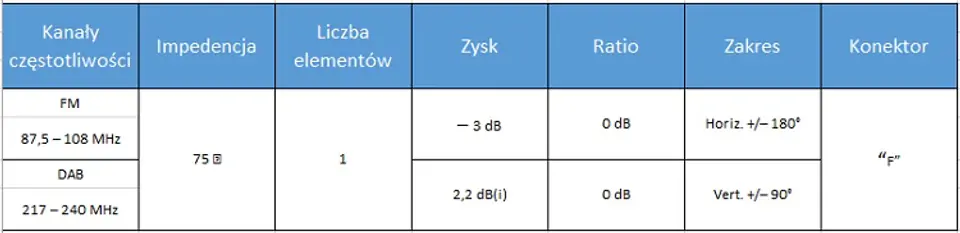 Cechy anteny radiowej DAB-FM Spacetronik SPA-DF01- Kanał (freq.): FM (87,5-108 MHz); DAB (217-240 MHz)- Liczba elementów: 2- Wzmocnienie: FM: -0,8 dB (i); DAB: 2,2 dB (i)- Ratio F / B: 0 dB- Szerokość wiązki: FM 360 °; DAB ± 90 °- Impedancja: 75 Ohm - Połączenie kabla koncentrycznego: Złącze żeńskie "F"- Nachylenie: 0-10 °- Montaż na maszcie o średnicy zewnętrznej: 20-62 mm