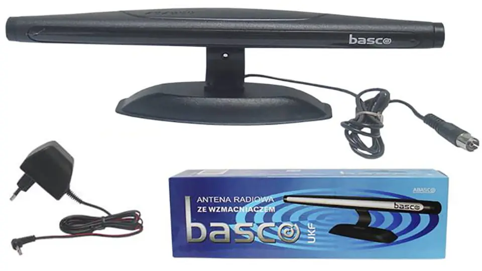 FM BASCO to prosta w montażu aktywna antena przeznaczona do użytku wewnętrznego. Przeznaczona jest do odbioru sygnałów radiowych w zakresie pasma FM (UKF) 88-108MHz. Antena posiada wbudowany wzmacniacz o wzmocnieniu 18dB. Jest wyposażona w kabel koncentryczny o długości 1,1m zakończony wtykiem radiowym. W zestawie z anteną jest dostarczony zasilacz sieciowy przeznaczony do zasilenia przedwzmacniacza anteny.