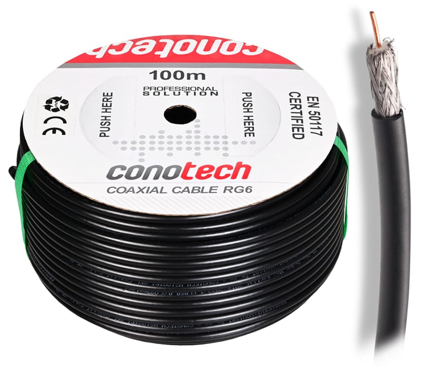 Wysokiej jakości, potrójnie ekranowany kabel koncentryczny typu RG6, o żyle wewnętrznej wykonanej z drutu miedzianego o średnicy 1,00 mm. Przewodnik został otulony polietylenem spienianym fizycznie azotem (N), cechującym się szczególnie skuteczną izolacją dielektryczną. Ekranowanie przewodu wykonane jest zgodnie ze standardem Trishield, w którym stosuje się potrójne zabezpieczenie rdzenia, składające się z warstwy folii aluminiowej AL/PET, oplotu aluminiowego o współczynniku pokrycia aż 90% oraz kolejnej warstwy folii aluminiowej AL/PET. Ponadto przewód został wypełniony żelem hydrofobowym, zapewniającym odporność kabla na wzdłużoną penetrację wody. Powłoka zewnętrzna wykonana jest z polietylenu (PE) w kolorze czarnym, o średnicy 6,8 mm, która pełni funkcję ochronną przed uszkodzeniami mechanicznymi oraz zewnętrznymi warunkami atmosferycznymi.
