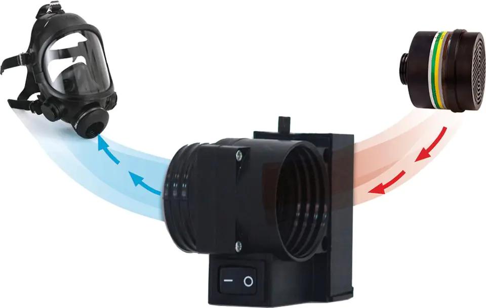 Obszary zastosowania: Do stosowania z odpowiednimi maskami pełnotwarzowymi, półmaskami i filtrami oddechowymi z okrągłym gwintem. Natychmiastowa gotowość do pracy dzięki dołączonemu akumulatorowi.