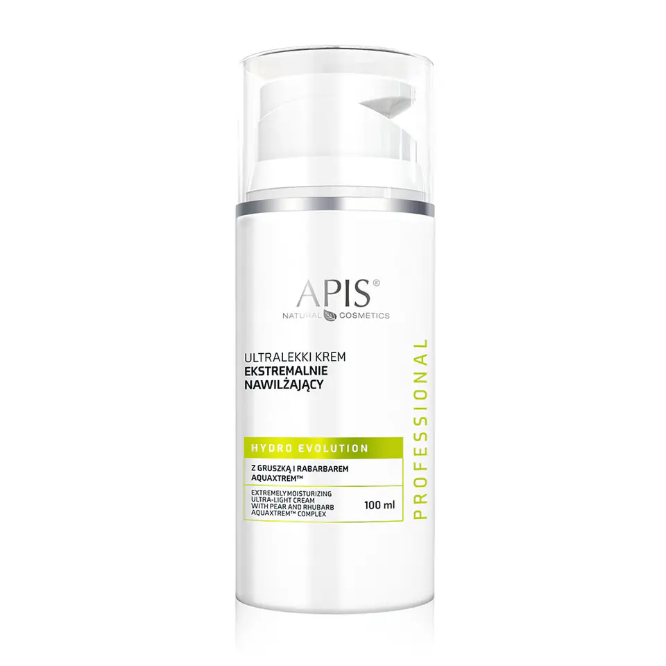 APIS Hydro Evolution ultralekki krem ekstremalnie nawilżający z gruszką i rabarbarem AQUAXTREM™ 100ml (P1)5901810001421Krem oparty o ekstrakt z gruszki, korzeni rabarbaru, aloesu, mimozy i kwas hialuronowy. Stymuluje naturalne nbspmechanizmy nawilżenia skóry, osiągając głębokie i długotrwałe efekty. Poprawia lipidową barierę skóry, zapobiega odwodnieniu. Dla cery odwodnionej i zniszczonej.