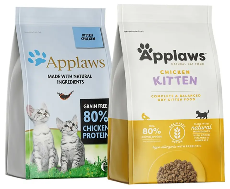 Applaws sucha karma dla kotów jest unikalną w swojej formule kompletną dietą, symulującą naturalny pokarm jakim odżywiają się koty na wolności. Koty są mięsożerne i ich system trawienny jest nastawiony na mięso. Sucha karma Applaws zawiera wysoką ilość białka zwierzęcego bez dużego poziomu węglowodanów i dodatków zbożowych występujących w innych karmach. Karma Applaws jest dzięki temu hipoalergiczna, bo nie zawiera typowych alergenów, jak soja, pszenica, kukurydza, czy innych zbóż. Zawiera zestaw antyutleniaczy, jak selen, naturalny tokoferol (witamina E), olej rozmarynowy. Naturalne kwasy Omega 3 i 6 wspomagają kondycję sierści. Wyciąg z żurawiny udrażnia drogi moczowe oraz wspomaga system trawienny. Naturalne prebiotyki wspomagają rozwój bakterii potrzebnych organizmowi do właściwej pracy układu trawiennego. Pokarm zawiera formułę odkłaczającą. Sucha Karma Applaws ma wręcz idealne proporcje zawartości wapnia i fosforu, spełniając w 100% zalecenia i limity organizacji FEDIAF.Applaws Sucha Karma dla Kociąt jest unikalną w swojej formule kompletną dietą, symulującą naturalny pokarm jakim odżywiają się koty.Jest wzbogacona o naturalne ekstrakty EHA i DPA z oleju z łososia. EHA działa na rozwój mózgu. Podobnie DPA wspomaga rozwój mózgu i systemu nerwowego.Skład: Poprzednia formuła:Mączka z suszonego mięsa kurczaka 62%, świeżo mielone mięso drobiowe 17%, ziemniaki, drożdże piwne, wysłodki buraczane, sos drobiowy 1%, olej łososiowy jako źródło Omega 3, EHA i DPA witaminy i minerały, suszone jaja, włókno celulozowe pochodzenia roślinnego 0,03%, chlorek sodu, węglan wapnia, wodorosty, żurawina, DL-metionina, chlorek potasu, wyciąg z juki, wyciąg cytrusowy, wyciąg z rozmarynu.Nowa formuła:Kurczak 49% (mączka z kurczaka 46%, świeżo przygotowany kurczak* 3%), ziemniaki*, tłuszcz drobiowy 9%, pulpa buraczana*, suszone drożdże piwne*, witaminy i minerały, sos drobiowy 1,5%, proszek jajeczny*, olej z łososia, Ekstrakt z cykorii* 0,2% (źródło prebiotycznego FOS), wodorosty*, ekstrakt z juki Schidigera*, sproszkowana żurawina.*Naturalne składniki.Dodatki dietetyczne na kg: Poprzednia formuła:Dodatki odżywcze: Witamina A (octan retinolu) 27 850 j.m/kg, witamina D3 (cholekalcyferol) 1 200 j.m/kg, witamina E (octan alfa-tokoferolu) 615 j.m/kg; Pierwiastki śladowe: selen z selenianu sodu 0,13 mg/kg, jod z bezwodnego jodanu wapnia 1,5 mg/kg, żelazo z jednowodnego siarczanu żelaza 80 mg/kg, miedź z pięciowodnego siarczanu miedzi 48 mg/kg, mangan (jako monohydrat siarczanu manganu) 38 mg/kg, cynk (jako monohydrat siarczanu cynku) 135 mg/kg.Dodatki technologiczne: E1705 Enterococcus faecium cernelle 68 (SF68; NCIMB 10415) 1000000000 CFU/kg jako pomoc w tworzeniu, utrzymaniu i odtwarzaniu naturalnej flory jelitowej u kotów, naturalny przeciwutleniacz: mieszany tokoferol.Nowa formuła:Witaminy: Witamina A 29000IU, Witamina D3 1000IU, Witamina E 640mg, Tauryna 1000mg. Aminokwasy: DL Metionina 250 mg. Pierwiastki śladowe: Jod (bezwodny jodan wapnia) 1 mg, żelazo (jednowodny siarczan żelaza (II)) 50 mg, cynk (jednowodny siarczan cynku) 100 mg, mangan (tlenek manganu (II)) 50 mg, miedź (pentahydrat siarczanu miedzi (II)) 5 mgAnaliza: Poprzednia formuła:Białko 38%, Surowe oleje i tłuszcze 20%, Błonnik 2,1%, Surowy popiół 10,5%, Omega 6: 3,8%, Omega 3: 0,8%, Wapń 2,3%, Fosfor 1,5%, Tauryna 2 000 mg/kg. Bez dodatku sztucznych barwników, przypraw lub konserwantów.Nowa formuła:Białko 38%, Włókno surowe 2%, Tłuszcz surowy 17%, Popiół surowy 8%, Omega-6 3,9%, Omega-3 0,6%, Wapń 1,3%, Fosfor 1%Dawkowanie:Zalecana porcja dzienna jest podana w przybliżeniu, ponieważ wymagania zależą od wieku, wielkości i poziomu aktywności, a także od tego, czy podawany jest również mokry pokarm. Dodawaj po kilka krokiecików dziennie, stopniowo zastępując starą dietę pokarmem Applaws przez co najmniej 10 dni. Każdy smakowity krokiecik może ważyć trochę więcej niż typowy, dlatego należy zachować umiar, aby nie przekarmić kota. Jeśli kot dostaje również mokry pokarm, to trzeba zmniejszyć porcje suchej karmy, aby zapobiec tyciu. Pamiętaj o zapewnieniu ciągłego dostępu do świeżej wody.