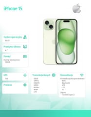 Dynamic Island.Oko na wszystko.Dynamic Island eksponuje alerty i wydarzenia na żywo, żeby Ci nie umknęły, gdy akurat robisz coś innego. Pozwoli najszybciej sterować odtwarzaniem muzyki, zobaczyć, kto dzwoni, i na przykład sprawdzić status lotu.Trwałośćna całość.Kolor na wskroś.Nowa, innowacyjna konstrukcja ma tył ze szkła, które w całości nasycono kolorem. Dzięki wzmocnieniu szkła w specjalnym procesie dwukrotnej wymiany jonowej i obudowie z lotniczego aluminium iPhone 15 jest niesamowicie wytrzymały.Chemia w służbie koloru.Drobne jony metali nasycają szkło kolorem za każdą barwę odpowiada inna ich kombinacja. Następnie szkło jest polerowane nanokrystalicznymi cząsteczkami i wytrawiane, żeby powstało teksturowane matowe wykończenie.Dobrze się trzyma.Obudowa ma niezwykle wytrzymałą ramkę z lotniczego aluminium i nową profilowaną krawędź, z którą lepiej leży w dłoni.Niesłychanie solidny.Warstwa Ceramic Shield z przodu obudowy jest supertwarda.Niebywale odporny.iPhone zniesie zachlapania, wodę oraz pył. Co za ulga.Nowy aparat główny 48 MP.Każde zdjęcie przechodzi pojęcie.Aparat główny rejestruje teraz obrazy o ultrawysokiej rozdzielczości. Co oznacza, że olśniewające, niesamowicie szczegółowe zdjęcia i te dokumentujące chwile, i te zapierające dech wyjdą Ci od teraz spod palca.Zoom, zoom, zoom.Trzy poziomy zoomu o jakości optycznej pozwolą Ci uchwycić idealne zbliżenie bez choćby ruchu w kierunku obiektu.