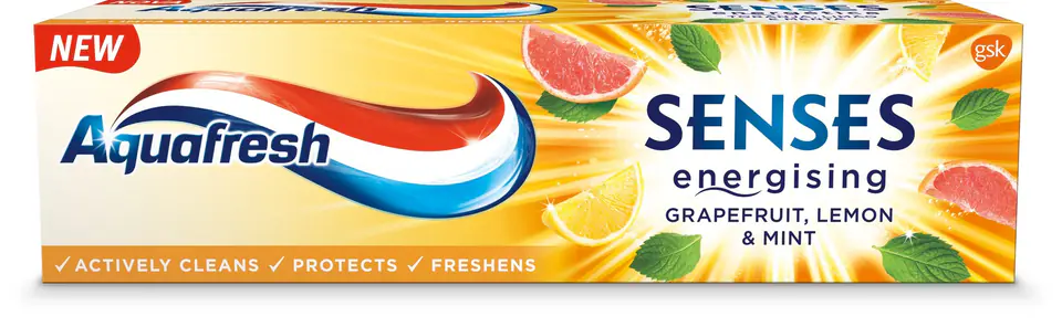 Odświeżająca pasta Aquafresh Senses to połącznie smaku grejfruta, cytryny i mięty udowadniajaca, że nie wszystkie pasty z fluorkiem muszą być takie same. Pasta do zębów Aquafresh Senses aktywnie czyści, chroni zęby i zapewnia natychmiastowy zastrzyk świeżości.