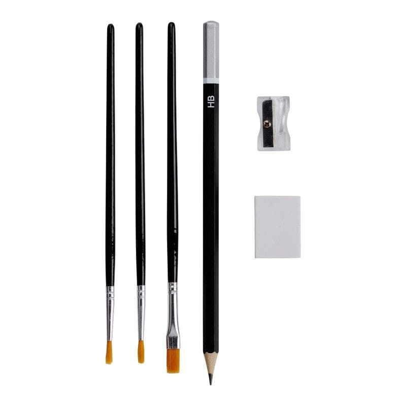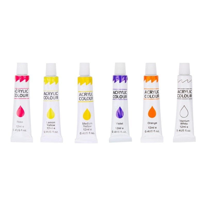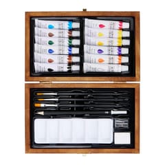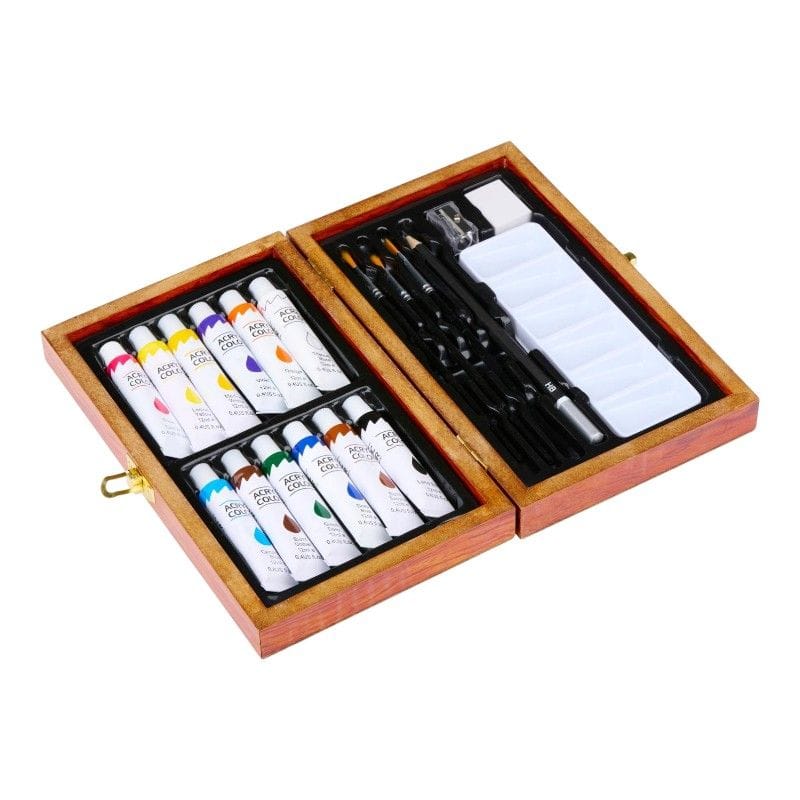 Zawartość zestawu:· 12 farb akrylowych (12 ml każda)· 3 pędzle w różnych rozmiarach· Paleta do mieszania kolorów· Ołówek HB z temperówką· Gumka do mazania· Drewniana skrzynka do przechowywania