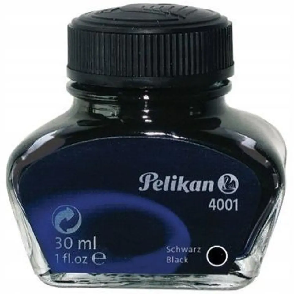 Atrament w szklanej butelce. Tradycyjny atrament w szklanej butelce z wglebieniem, stanowiącym podstawke pod pióro Oryginalny ksztalt butelki od 1897