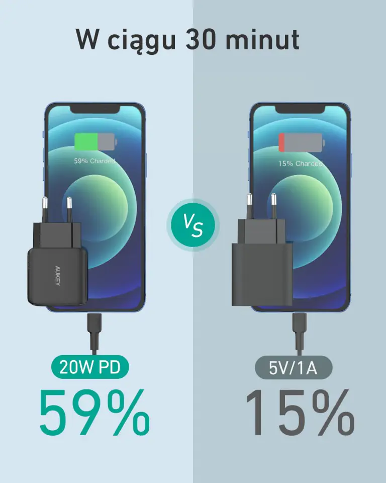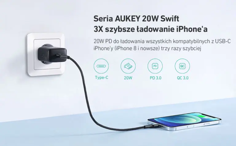 Szybka ładowarka Aukey PA-R1 wyposażona została w zaawansowane technologie Power Delivery 3.0 oraz Quick Charge 3.0. Urządzenia naładujesz dzięki niej nawet trzykrotnie szybciej niż przy użyciu tradycyjnej ładowarki. Dość powiedzieć, że wystarczy tylko 30 minut, by od 0% do 59% naładować na przykład iPhonea 12! Oszczędność czasu i nerwów? Jeszcze jaka!