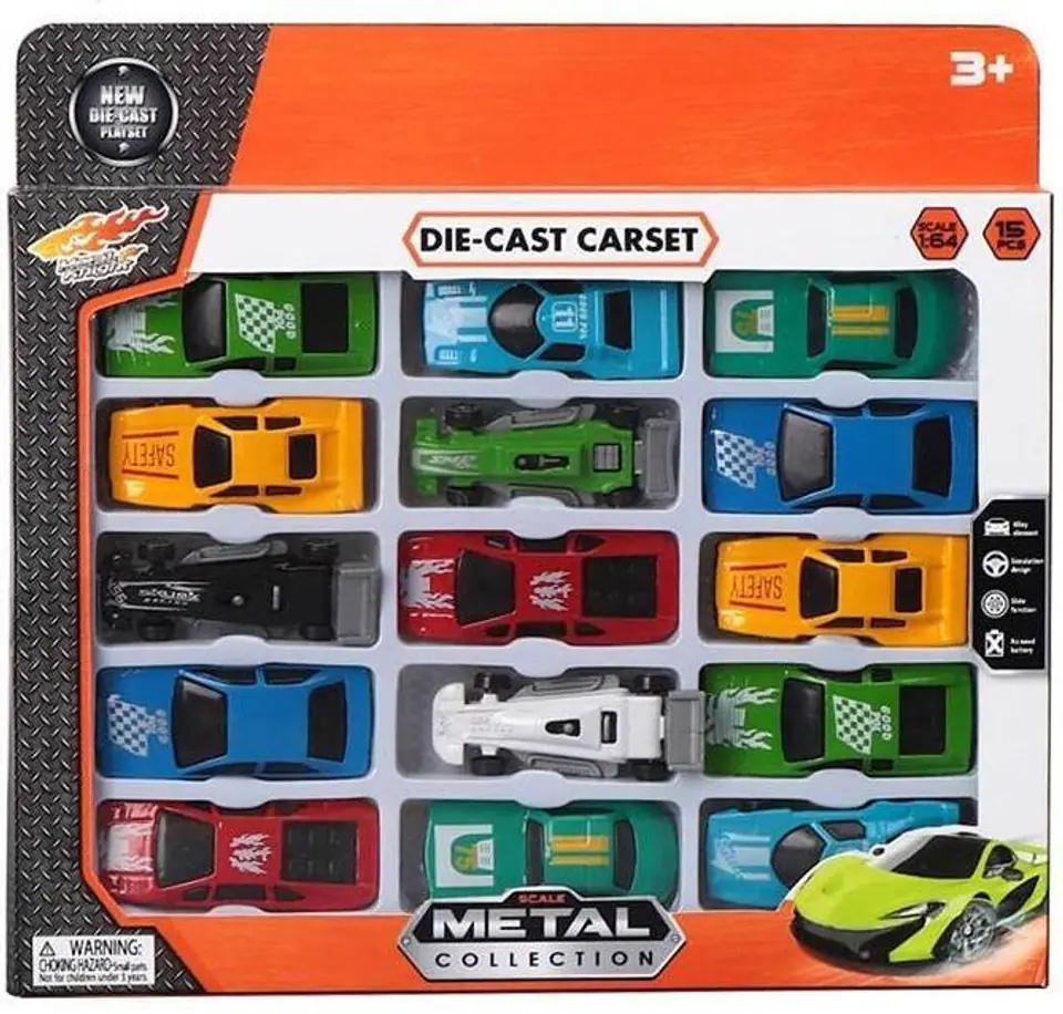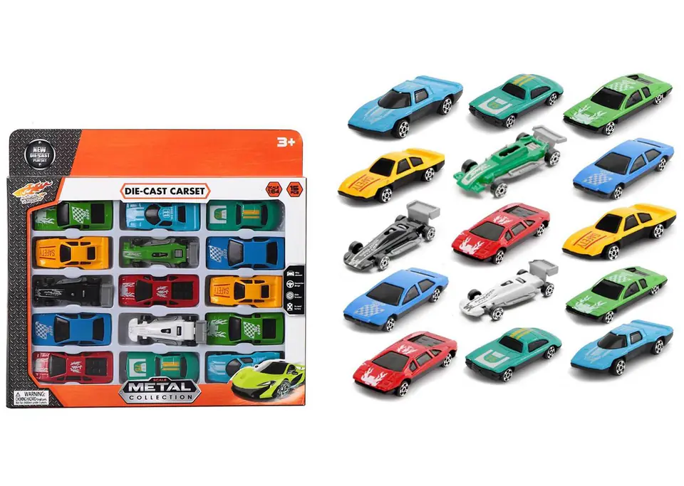 Jeśli twoje dziecko jest fanem motoryzacji to koniecznie musi mieć taki komplet w domu! W zestawie znajduje się 15 sportowych resoraków. Wyglądem przypominają realistyczne mini pojazdy, które biorą udział w wyścigach samochodowych. Autka składają się z metalowej karoserii, środek jest wykonany z plastiku, temu autka są lekkie i idealnie mieszczą się w małej rączce.