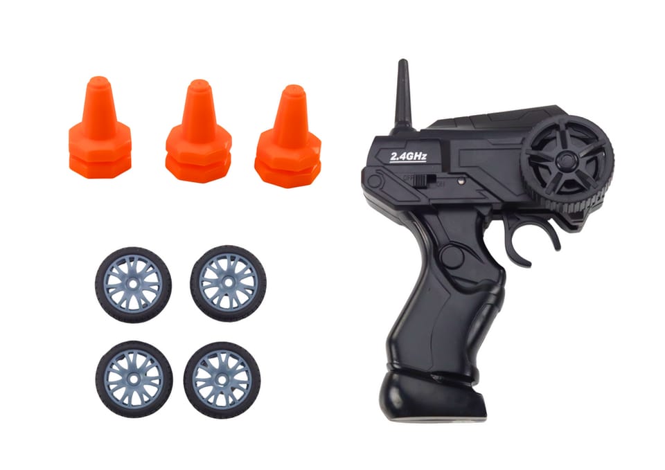 Niebieski samochód to nie tylko elegancki wybór kolorystyczny, ale również połączenie stylowego designu z imponującą wydajnością. W zestawie znajdziesz 6 pomarańczowych pachołków, które pozwalają na dostosowanie trasy do własnych preferencji oraz dwa komplety kół - jedne z bieżnikiem dla pełnej stabilności, a drugie gładkie, idealne do efektownego driftu.