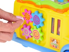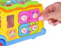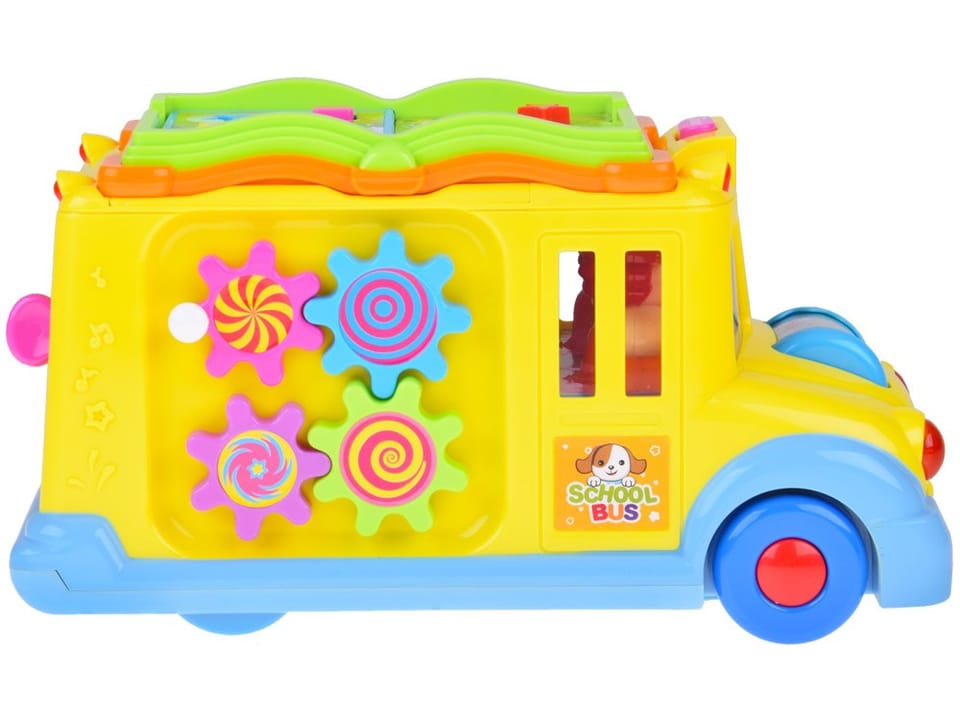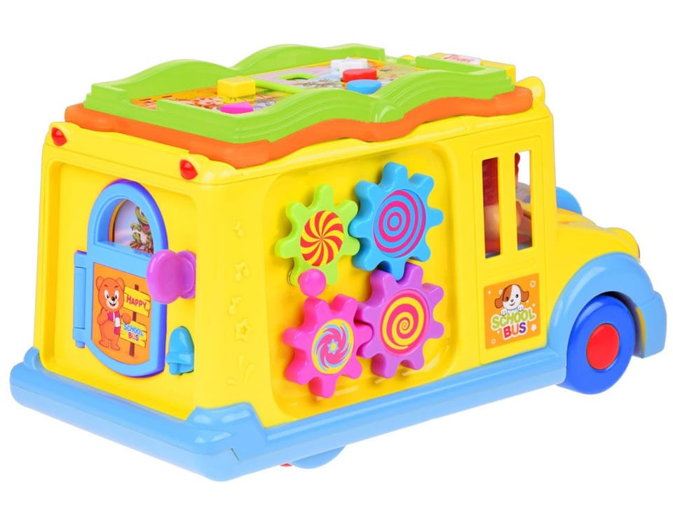 Autobus szkolny interaktywny potrafi samodzielnie jeździć, zmieniając za każdym razem kierunek, kiedy napotka przeszkodę, ale może też być sterowane samodzielnie przez dziecko. W trakcie jazdy gra wesoła muzyczka i migają przednie światła. Z przodu autobusu znajduje się kolorowy obrotowy wałek ze zwierzątkami, który po przekręceniu powoduję uruchomienie odgłosy śmiejącego się dziecka i melodyjki.