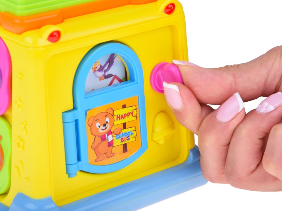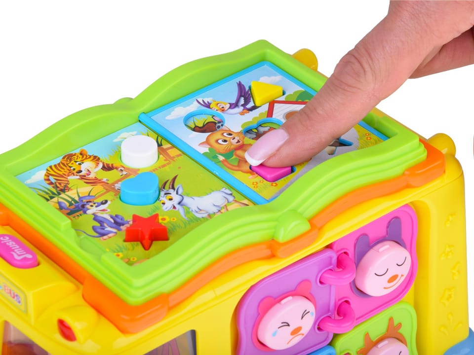 Na dachu zabawki grający autobus, znajduje się kolorowa książeczka, z przyciskami o różnych kolorach i kształtach. Przyciśnięcie guziczków powoduje uruchomienie dźwięków zwierzątek, które są na obrazku. Przyciski uruchamiają także dźwięki odgłosu klaksonu, odpalania silnika, melodie.