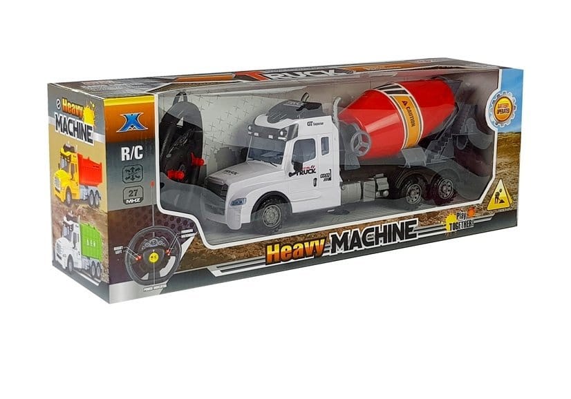 Zdalnie sterowany pojazd budowlany dla dzieci osadzony jest na bieżnikowanych, plastikowych kołach, które umożliwią zabawę na różnych powierzchniach. Biała betoniarka z czerwoną gruszką ozdobiona jest kontrastującymi, czarnymi detalami, a także charakterystycznymi naklejkami.