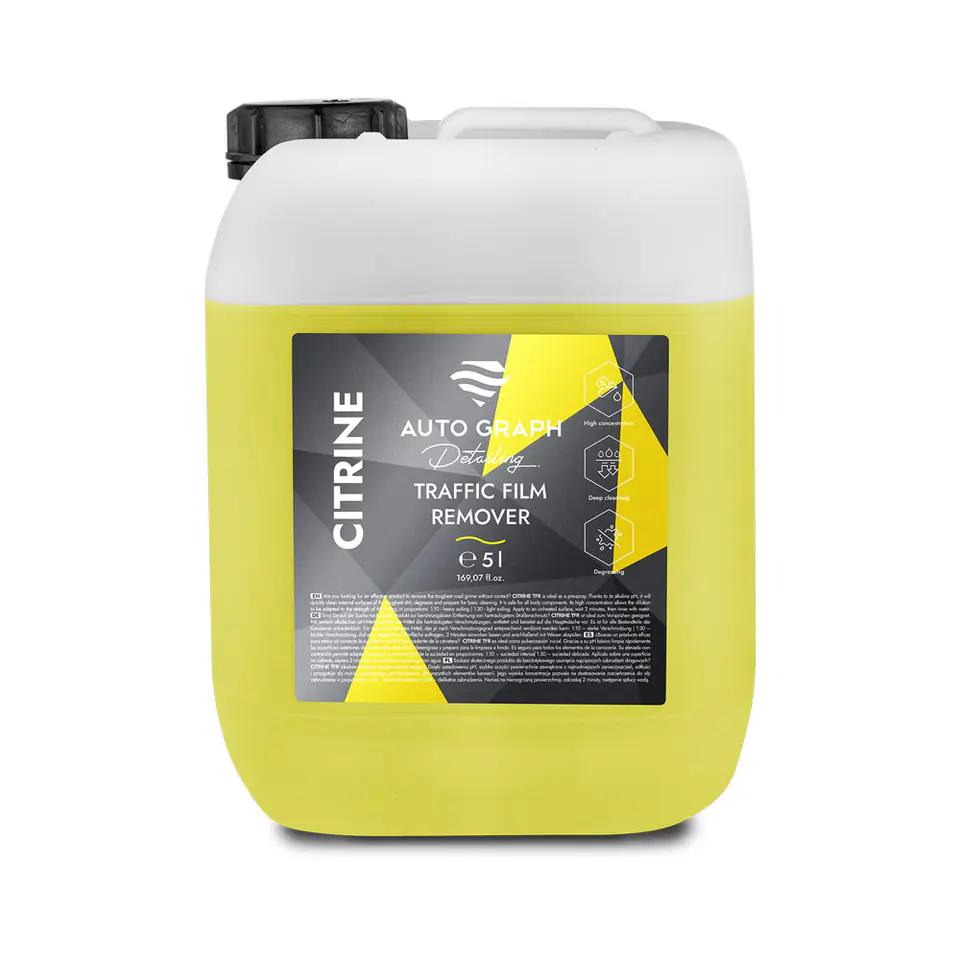 Szukasz skutecznego produktu do bezdotykowego usunięcia najcięższych zabrudzeń drogowych? Citrine Traffic Film Remover idealnie sprawdzi się jako oprysk wstępny. Dzięki zasadowemu pH, szybko oczyści powierzchnie zewnętrzne z najtrudniejszych zanieczyszczeń, odtłuści i przygotuje do mycia zasadniczego. Z łatwością poradzi sobie z różnorodnymi zabrudzeniami, takimi jak film drogowy, zaschnięte owady, czy tłuste plamy. Jest bezpieczny dla wszystkich elementów karoserii, felg i opon. Jego wysoka koncentracja pozwala na dostosowanie rozcieńczenia do siły zabrudzenia.