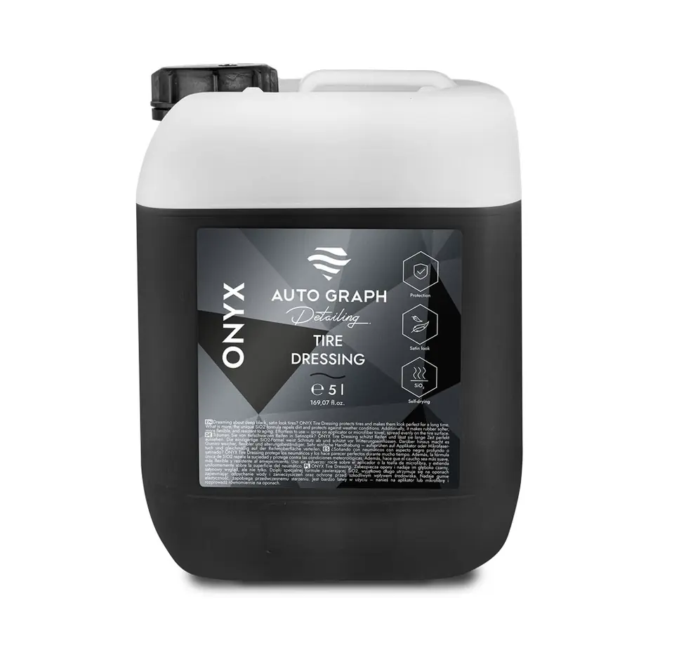 Auto Graph Onyx Tire Dressing – to produkt przeznaczony do zabezpieczenia opon nadający im elegancki, głęboko czarny, satynowy wygląd – ale nie tylko. Dzięki specjalnej formule produktu zawierającej SiO2 wyjątkowo długo utrzymuje się na oponach, zapewniając odpychanie wody i zanieczyszczeń oraz ochronę przed szkodliwym wpływem środowiska. Nadaje gumie elastyczność, zapobiega przedwczesnemu starzeniu.