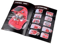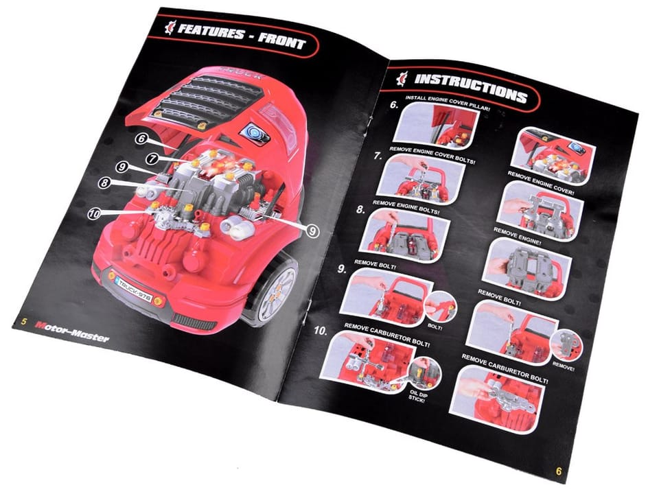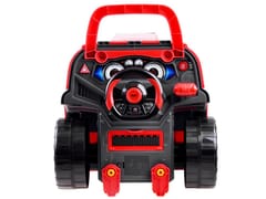 Auto z silnikiem do rozkręcania. Warsztat samochodowy dla małego mechanika składający się z 61 elementów zapewni każdemu małemu mechanikowi samochodowemu mnóstwo pracy. Zabawka w całości wykonana z plastiku w czerwono czarnym kolorze, pozwoli na wspaniałą zabawę.Zadanie dla mechanika i atrakcje pojazdu:- należy otworzyć maskę- pod maską należy sprawdzić poziom oleju- sprawdzić jakość świec zapłonowych- silnik do remontu - rozkręcenie i skręcenie go to zadanie dla solidnego mechanika- odkręcenie kół i felg - też należy sprawdzić przed jazdąW "kabinie" kierowca znajdzie- czerwony guzik start/stop - dziecko usłyszy odgłos odpalanego silnika i jego pracę- lewarek z oznaczeniami - P,R,N - słychać odgłos jadącego pojazdu, pracę silnika- trójkąt ostrzegawczy - migają światła z przodu i słychać efekt dźwiękowy- kierownica z klaksonem- pod kierownicą znajduje się schowek na drobiazgi oraz dźwignia podnośnika umożliwiająca sprawne odkręcenie kół- na samej górze znajduje się rączka pozwalająca zaparkować pojazd w dogodnym miejscu - samochód świeci białymi światłamiAlarm z pilotem- Po zakończonej pracy należy zamknąć auto. Służy do tego pilot wyposażony w 3 przyciski, dzięki którym można zasymulować zamykanie i otwieranie samochodu. Towarzyszą temu odgłosy odpowiednio zamykania lub otwierania auta oraz efekty świetlne reflektorów. Trzeci przycisk służy do zdalnego uruchamiania klaksonu, również z mignięciem światłami.