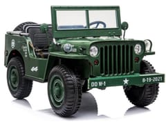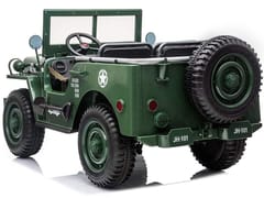 Wojskowy terenowy samochód 3 osobowy to propozycja dla wszystkich dzieci lubiących tematy militarne. Wojskowy jeep, mocny, silny, duży masywny pojazd, który na pewno sprosta wojskowym zadaniom. Terenowy wojskowy samochód jak przystało na taki pojazd został zaopatrzony we wszystkie niezbędne akcesoria i wzmocnienia. Samochód z napędem na cztery koła ma opcje przełączania na dwa silniki, dzięki czemu to kierowca decyduje kiedy ma używać dany napęd. Auto wyposażone zostało w schowki, bagażnik, saperkę. Posiada efekty dźwiękowe, świetlne, składaną przednią szybę, szerokie fotele. Pojazd ma opcję sterowania za pomocą pilota lub samodzielnie przez kierowcę. Auto wyposażone jest w 4 mocne silniki 12V 45W + 1 x akumulator żelowy 12V14Ah + pilot 2,4Ghz dla rodzica