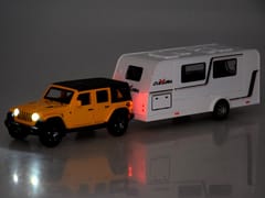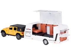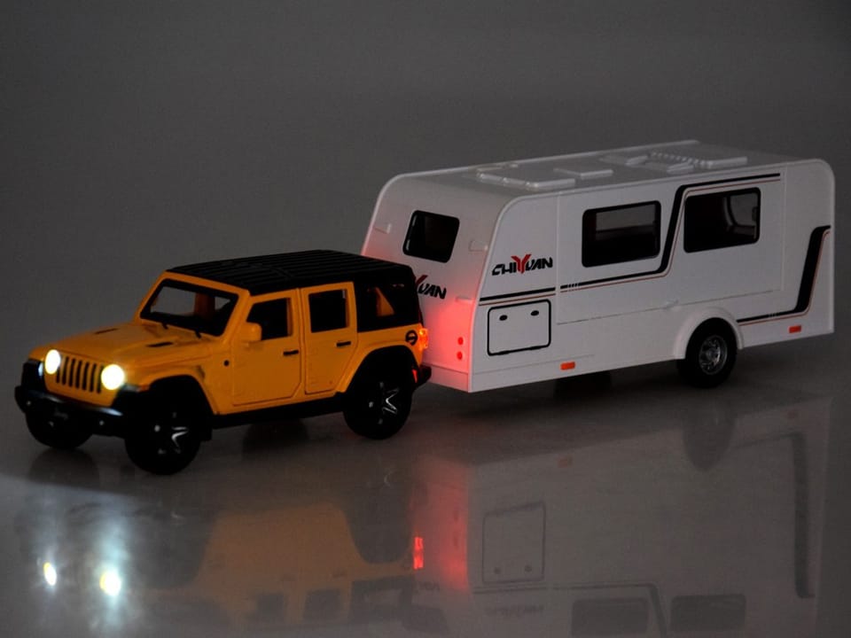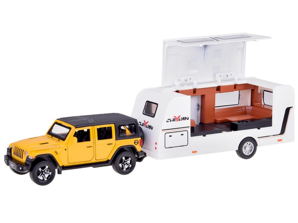 W zestawie znajdziesz:- terenowy samochód - przyczepa kampingowa- zapasowe zaczepy do przyczepy