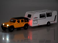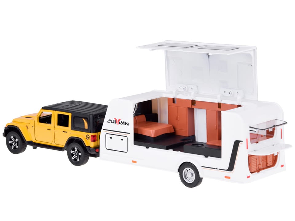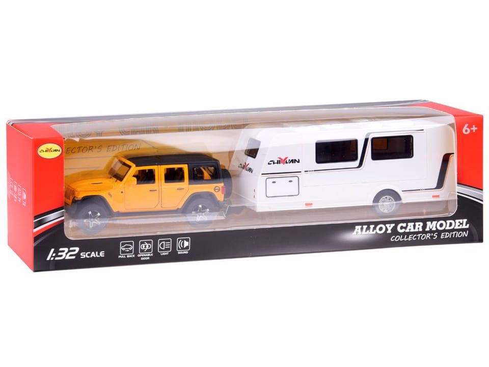 Auto terenowe + przyczepa kempingowa to idealna zabawka, która przeniesie Twoje dziecko w świat wakacyjnych przygód! Metalowy, terenowy samochód został wykonany z niezwykłą dbałością o detale, a świecące reflektory podczas jazdy dodają mu realistycznego wyglądu. Model w skali 1:32 doskonale odwzorowuje popularnego SUV-a, łącząc w sobie trwałość oraz wysoką jakość wykonania z tworzywa sztucznego.