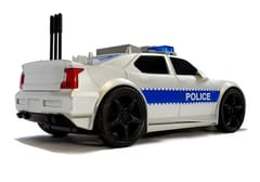 Wóz policyjny został zaprojektowany z myślą o wszystkich młodych fanach policji i służb porządkowych. Zapewne znajdzie zastosowanie u małego przyszłego policjant. Dzięki autku będzie mógł poczuć się jak prawdziwy profesjonalista. Wyprodukowano go w skali 1:20, co umożliwiło bardzo dokładne odwzorowanie charakterystycznych elementów. Klasyczny srebrny połączony z napisami policyjnymi, sprawia że maluch poczuje się jak mały policjant. Samochód posiada typową sportową konstrukcję. Przednia i boczne szyby są przyciemnione. Auto posiada napęd frykcyjny, wystarczy pociągnąć do tyłu, puścić i obserwować jak mknie w przód. Na dachu wozu policyjnego umieszczone są trzy przyciski wciśnięcie każdego z nich aktywuje inny dźwięk. Jadąc na akcje słychać syrenę i każdy będzie już schodził Ci z drogi. Każdemu z wymienionych dźwięków towarzyszą efekty świetlne, czyli migające, czerwono-niebieskie światła. Po naciśnięciu dużego przycisku automatycznie otwiera się tylni bagażnik.