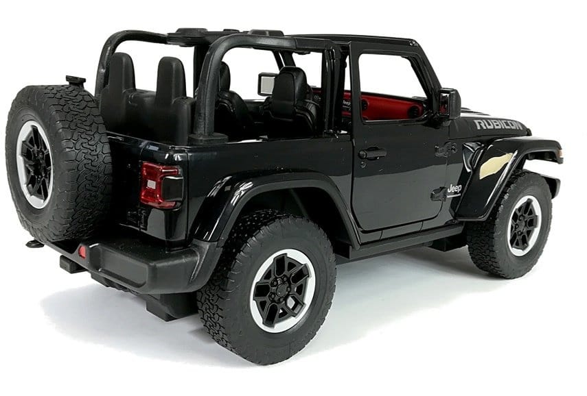 Zdalnie sterowany samochód Jeep Wrangler Rubicon w kolorze czarnym to autentyczna replika w skali 1:14. Samochód za pomocą pilota porusza się do przodu, do tyłu, skręca oraz hamuje. Ze względu na swój terenowy charakter może być stosowany zarówno wewnątrz jak i na zewnątrz. Światła w pojeździe uruchamiają się kiedy jest uruchomiony oraz kiedy jedzie. Drzwi pojazdu są otwierane ręcznie, wnętrze i podwozie pojazdu są zaprojektowane bardzo dokładnie z dbałością o zgodność z oryginalnym pojazdem. Zdalnie sterowany Jeep jest kierowany za pomocą pilota działającego radiowo, osiąga prędkość 7 kilometrów na godzinę. Pilot ma zasięg około kilkunastu metrów i w przeciwieństwie od pilotów na podczerwień może być bez żadnych problemów używany na zewnątrz przy pełnym słońcu.