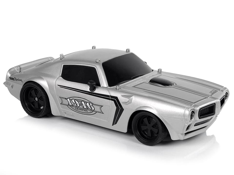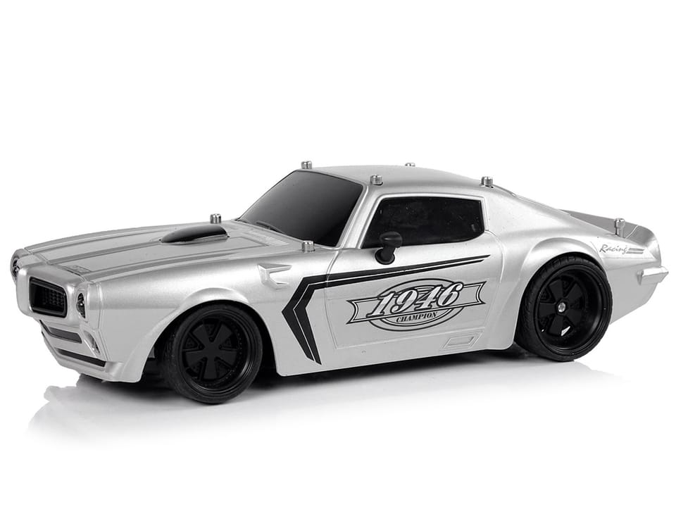 Samochód posiada lekką i wytrzymałą konstrukcję, sportowy design z czarnymi szybami i czarnymi detalami na masce oraz naklejkami 1946 Champion. Gumowe opony gwarantują przyczepność do podłoża podczas sterowania. Kierowanie pojazdem sprawia wielką frajdę zwłaszcza najmłodszym, dlatego pilot załączony w zestawie pozwoli pokierować mały modelem auta, posiada dwa osobne przyciski do jazdy w przód/ tył i na boki.