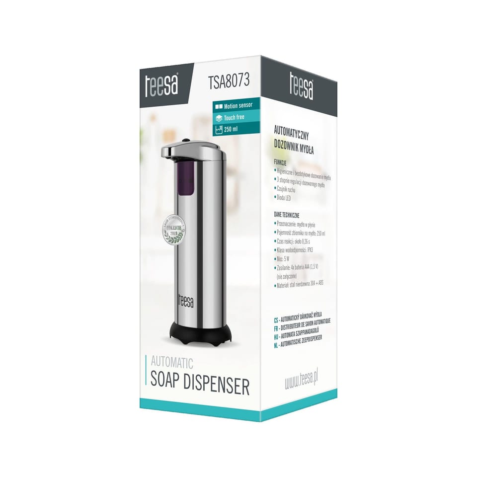 Automatyczny dozownik mydła Teesa TSA8073 Brak konieczności naciskania jakiegokolwiek przycisku sprawia, że bezdotykowe dozowniki do mydła są niezwykle higieniczne i bez wątpienia stanowią absolutny niezbędnik w każdym miejscu użytku publicznego, np. galerii handlowej czy kinie. To nie musi być jednak jedyne zastosowanie takiego urządzenia, bo wybierając model, który dodatkowo posiada stylowy wygląd, będzie on stanowił doskonałe doposażenie nowoczesnego biura albo domowej łazienki. Właśnie taki jest automatyczny dozownik do mydła marki Teesa.
