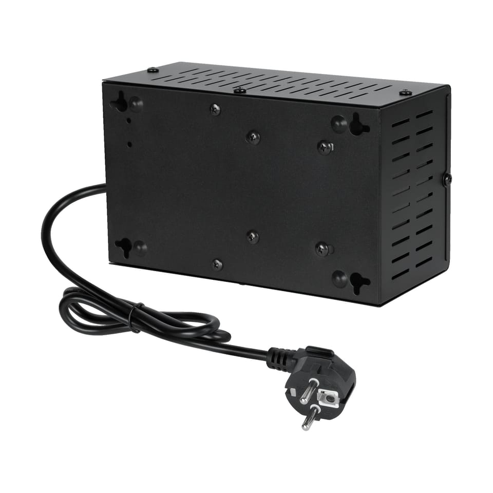 Wejście: Zakres napięcia 150 - 270 V ACWejście: Częstotliwość 50/60 HzWyjście: Napięcie 230 VWyjście: Częstotliwość 50/60 HzWyjście: Precyzja ±8%Napięcie wyjściowe: Jedna fazaTransformator EISprawność: 98%Zabezpieczenia: przed zbyt wysokim i niskim napięciem, przeciążeniem, przegrzaniem, zwarciemOpóźnienie: Brak opóźnienia / opóźnienie (180/6 sekund)Temperatura pracy: 0~40°CWilgotność względna: 10%~90%Temperatura przechowywania: -15~45°C----------Waga: 2,25 kgWymiary: 117 x 197 x 90 mm