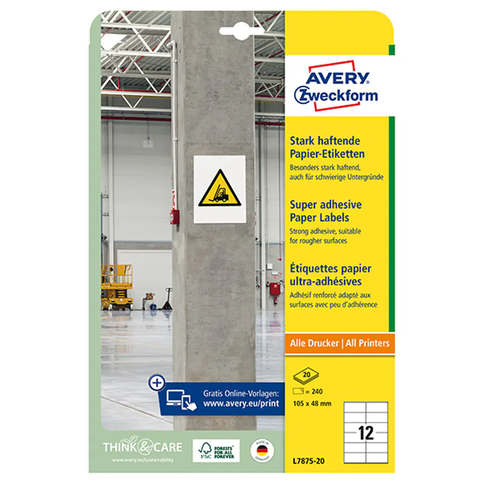 Avery Zweckform etykiety 105mm x 48mm, A4, białe, 12 etykiety, o wysokiej przylepności, pakowane po 20 szt., L7875-20, do drukarek