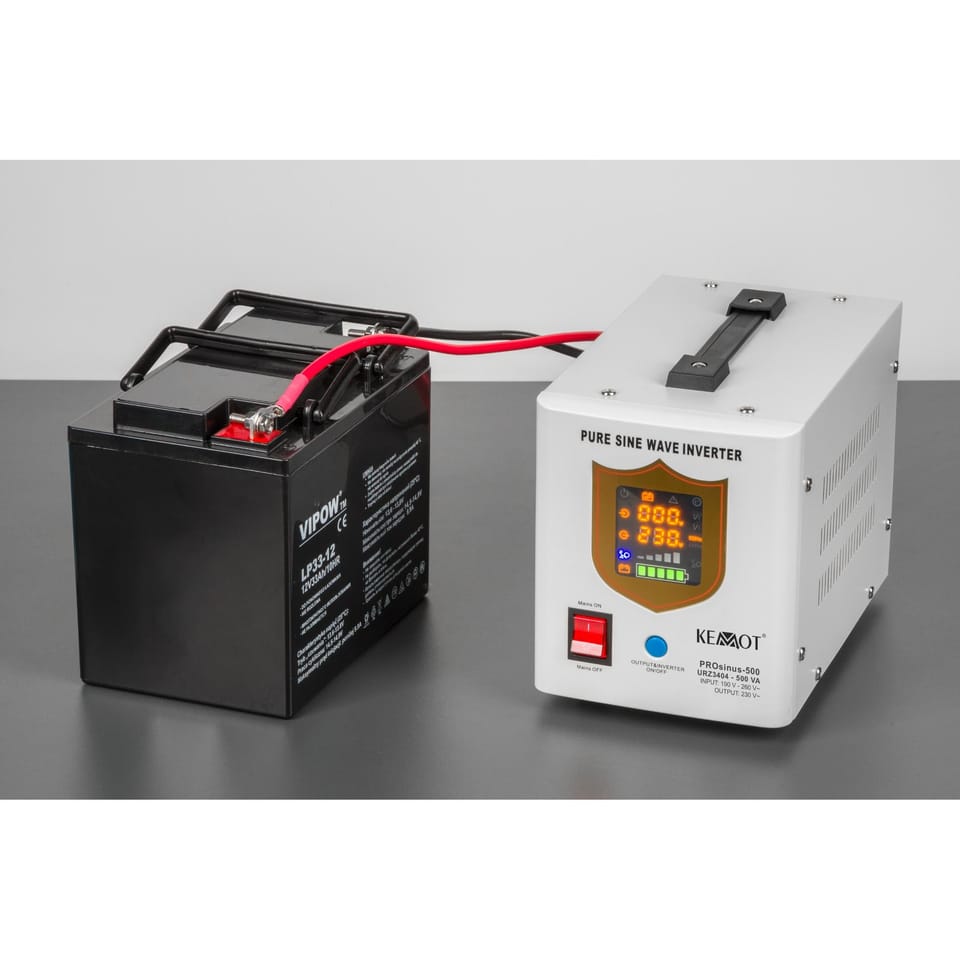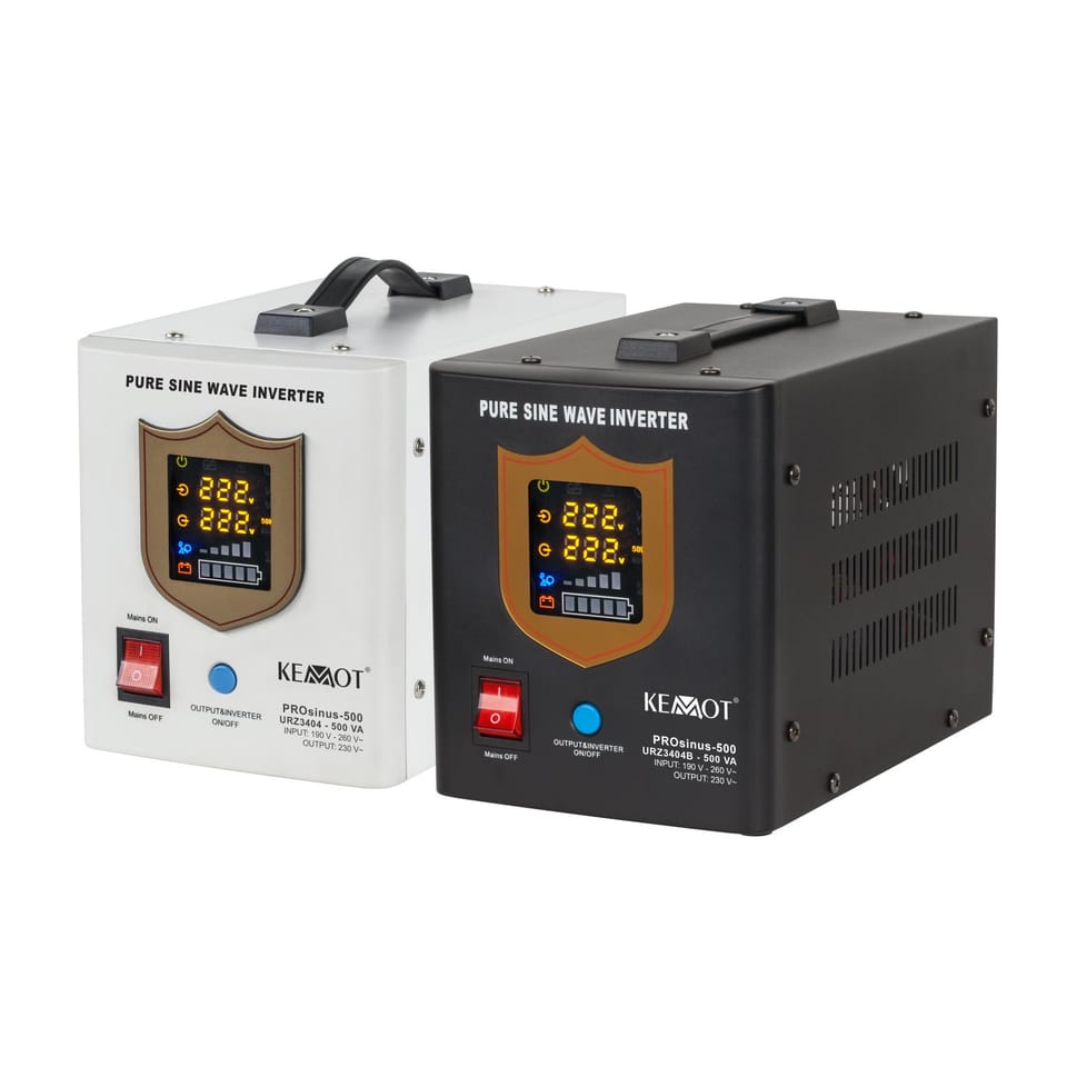 Seria urządzeń PROsinus marki KEMOT doskonale sprawdzi się do zasilania np. pomp centralnego ogrzewania lub pomp w instalacjach kominków, a także silników indukcyjnych, czy np. urządzeń automatyki instalacji z wykorzystaniem konwektorów ciepła oraz wszelkich urządzeń wyjątkowo wrażliwych na najmniejsze zmiany kształtu napięcia. Ich zaletą jest czysty sinusoidalny przebieg napięcia wyjściowego (zasilającego odbiory), dzięki któremu urządzenie zapewnia stabilną pracę, zapobiegając efektowi przegrzewania się odbiorów indukcyjnych. Wraz z akumulatorem 12V stanowią kompletne urządzenie zasilania gwarantowanego 230 VAC.