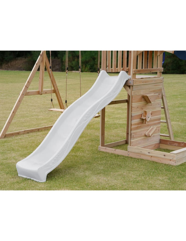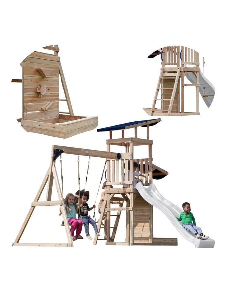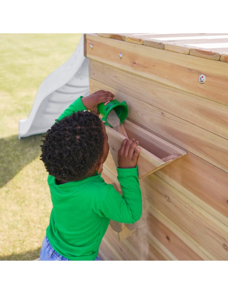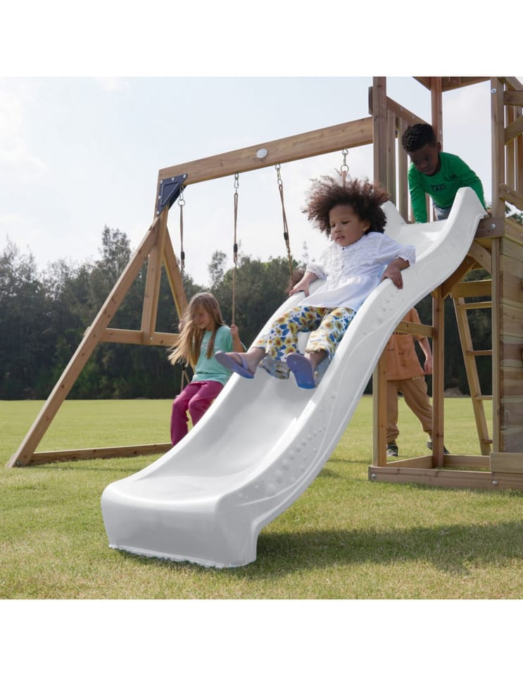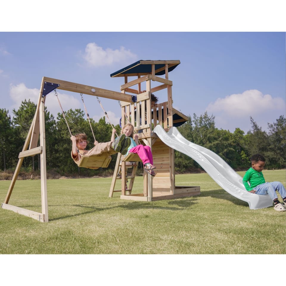- Wielofunkcyjny zestaw do zabawy – wspinaczka, zjeżdżanie, huśtanie się i zabawa w piasku w jednym miejscu! - Podwójna huśtawka - Długa 220 cm zjeżdżalnia z możliwością podłączenia wody dla dodatkowej frajdy w upalne dni - Piaskownica z daszkiem i ścianką do zabawy - Bezpieczna i stabilna konstrukcja – zestaw posiada 6 kotew gruntowych dla maksymalnej stabilności - Zestaw przeznaczony dla maksymalnie 5 dzieci ( Maksymalna waga na dziecko: 50 kg ) - Łatwy montaż – proste instrukcje i częściowo wstępnie zmontowane elementy pozwalają na szybkie złożenie placu zabaw.