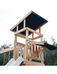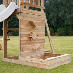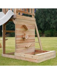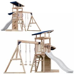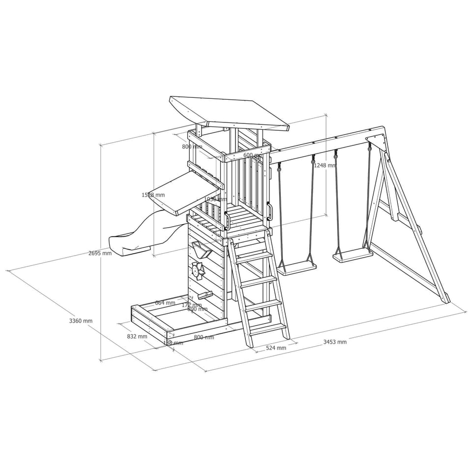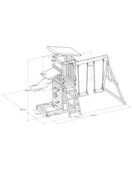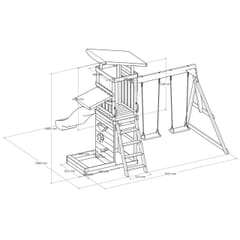 ✔ Wymiary całkowite: 345 x 336 x 269,5 cm ✔ Wysokość platformy: 119 cm ✔ Waga maksymalna: 200 kg (50 kg na dziecko) ✔ Zjeżdżalnia: 220 cm, możliwość podłączenia wody ✔ Piaskownica: 125 kg piasku, wymiary 83,2 x 80 x 18,8 cm
